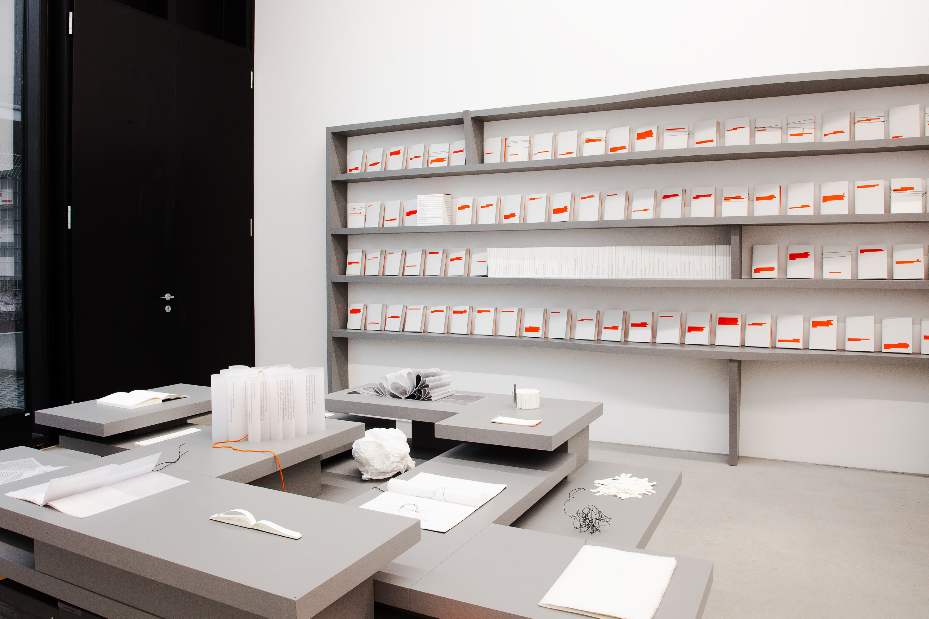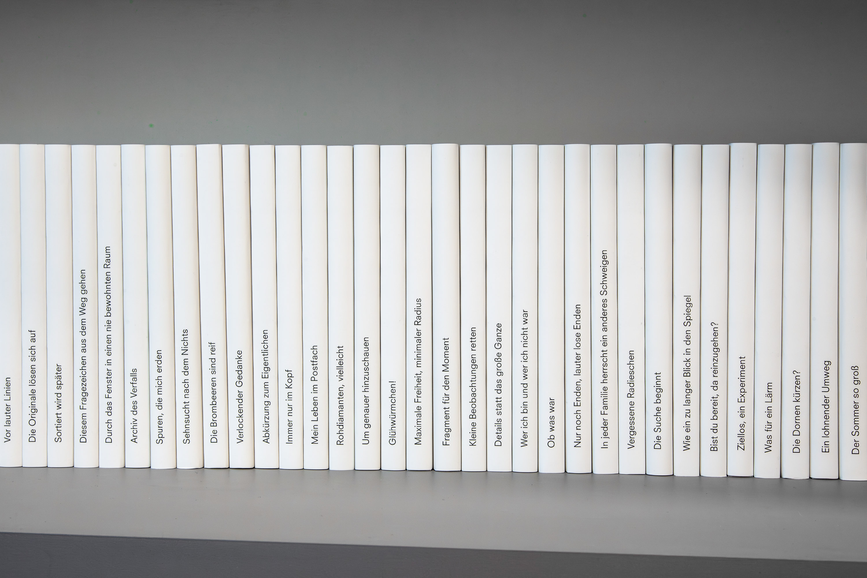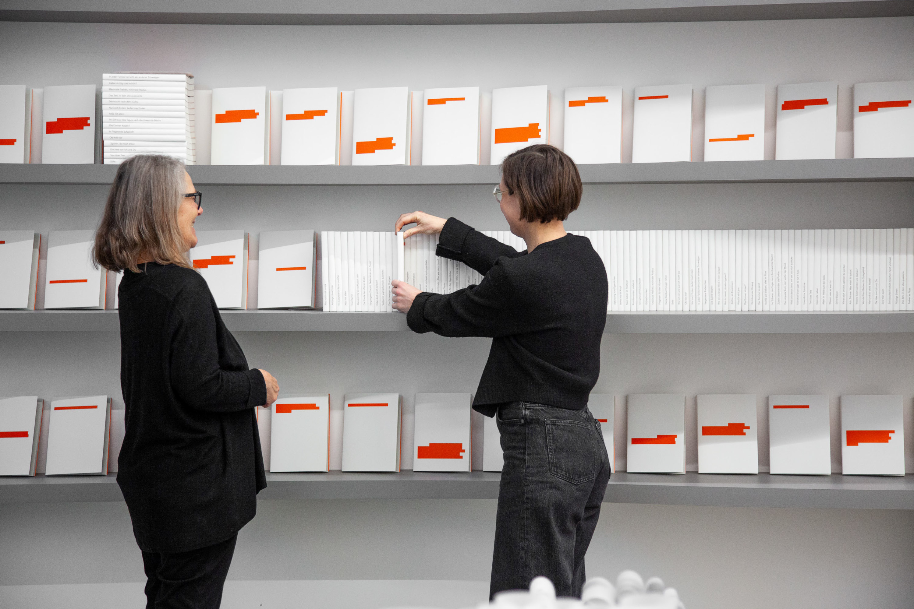 Für ihre Ausstellung im einBuch.haus führen die beiden Künstlerinnen ihren Dialog fort, die Zeilen verdichten sich zu 100 Titeln für offene, noch leere Bücher. Wandelnde Fragmente, die immer neue Geschichten erzählen, in anderen Bedeutungen für die Person, die darin weiterschreibt, zeichnet, denkt. Die von den Künstlerinnen handgezeichneten Punktraster setzen eine feine Struktur für ›unmöglich viele Endlichkeiten‹.