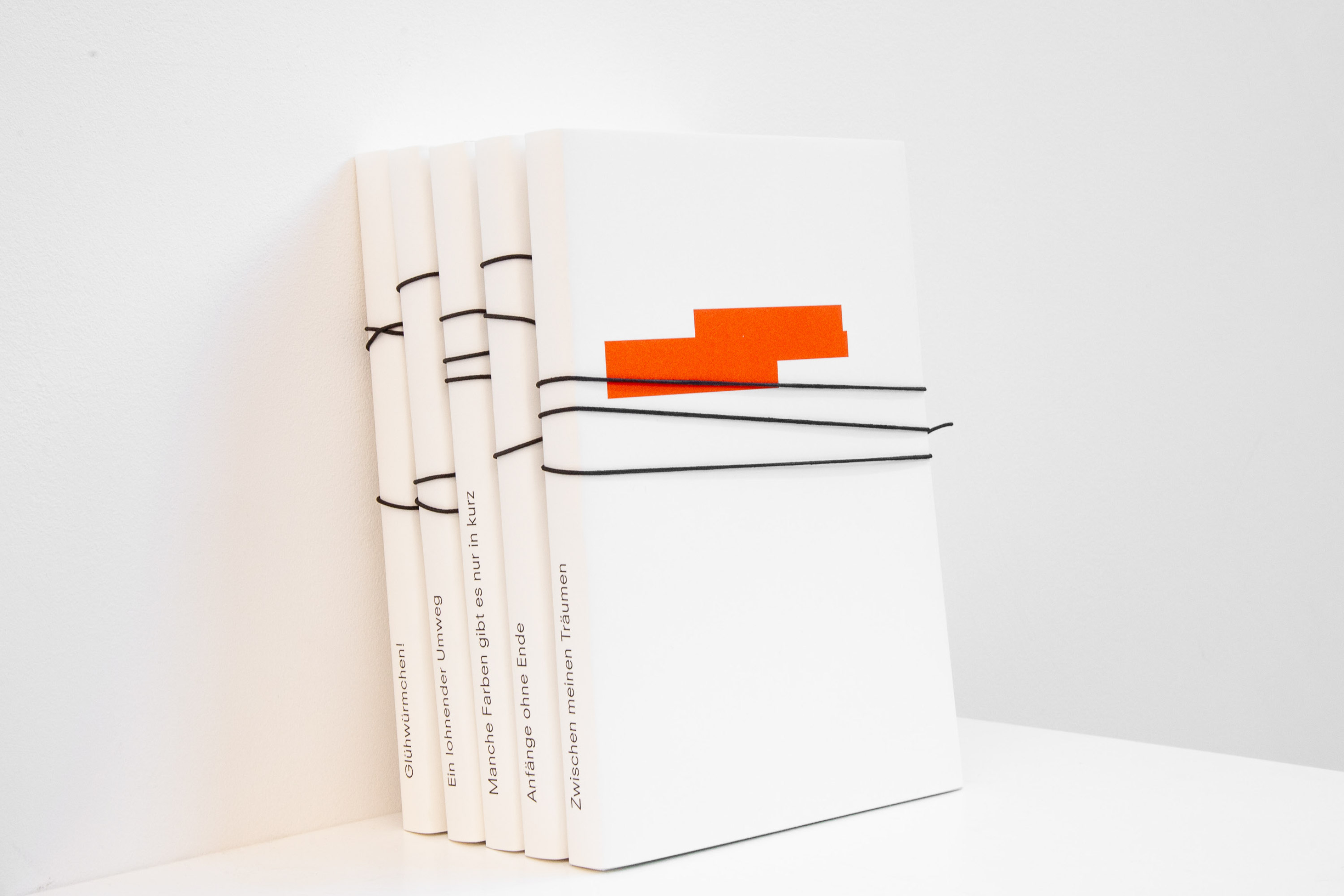 Der Schutzumschlag macht jedes Buch zum Unikat – mit individuellem Buchtitel auf dem Rücken, dazu die abstrakte Form der entsprechenden orangenen Markierung im Text auf dem Cover. Ein klappbares Lesezeichen versammelt alle 100 Titel als Liste im Buch.